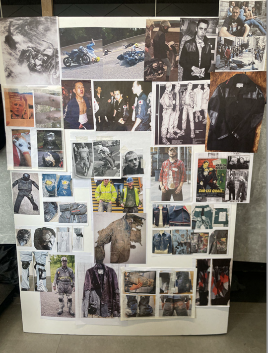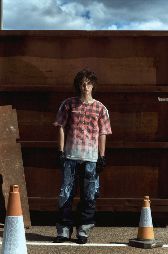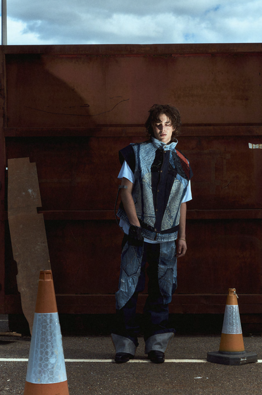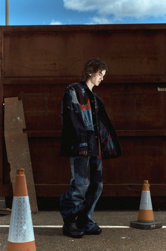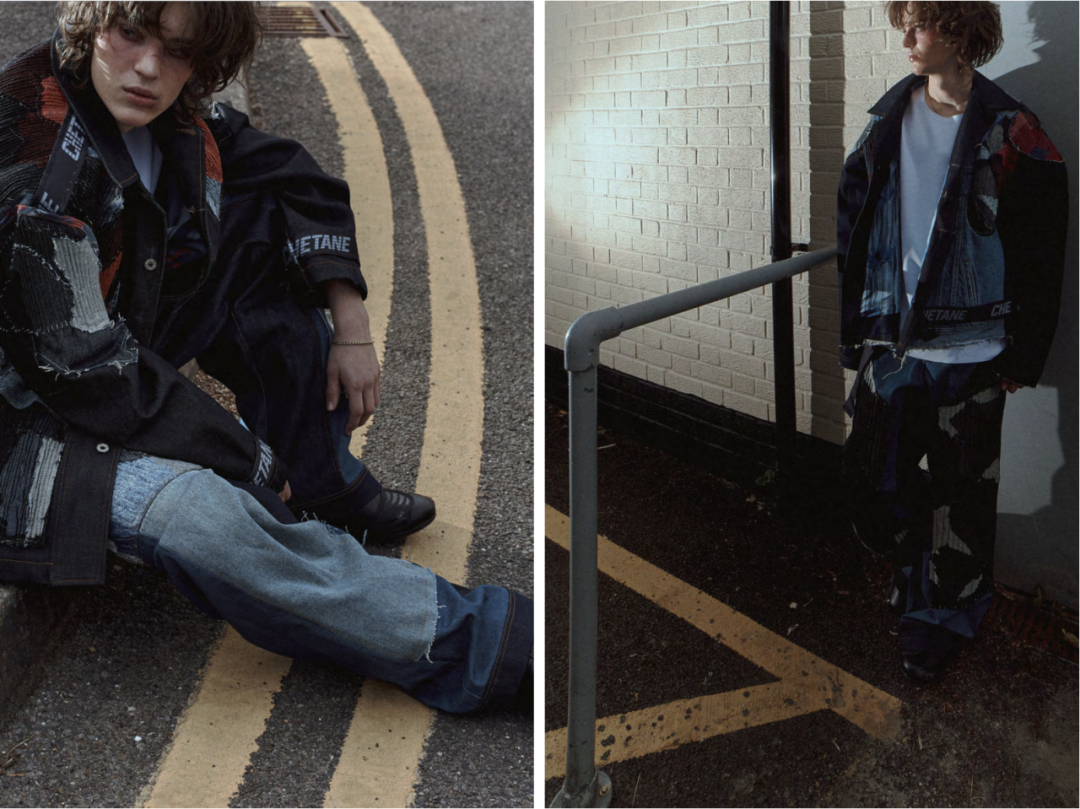 Chetane 的作品采用回收牛仔布和未经处理的原始牛仔布,结合摩托车服装中的弹性面板结构,打造出如同破碎盔甲般的服装形态。这些设计不仅体现了工装文化的实用性,更通过材料的改造,展现了年轻男性在社会中试图展现坚强外表却压抑内心脆弱的矛盾状态。