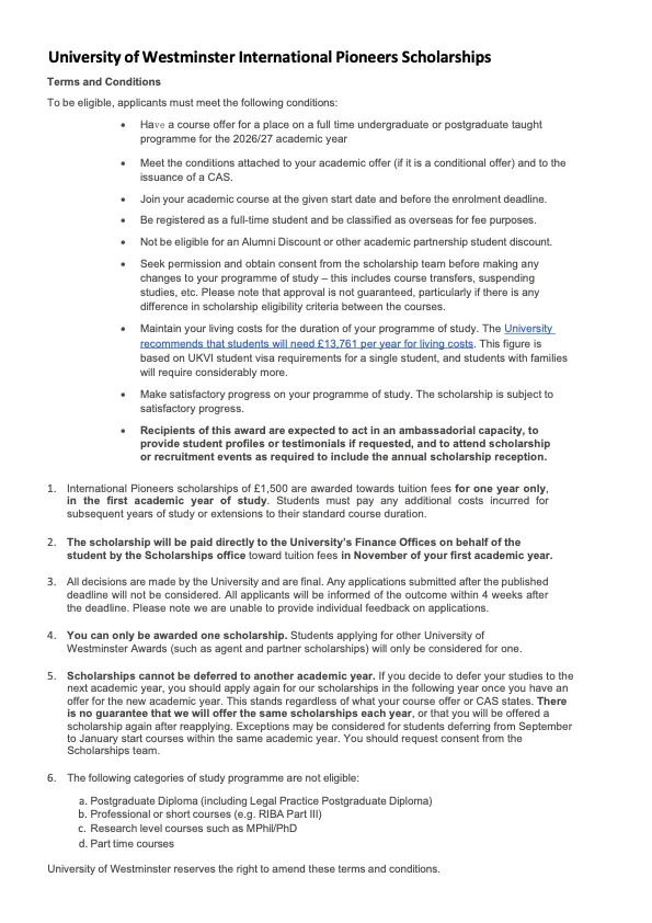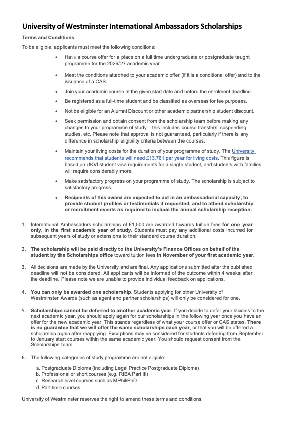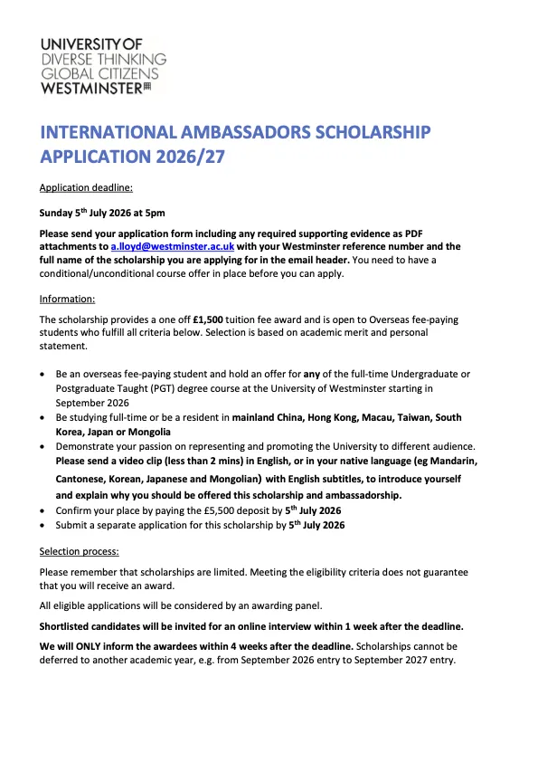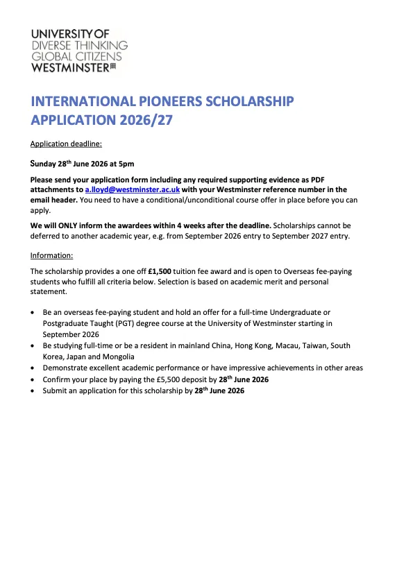 好消息来得刚刚好——威斯敏斯特大学2026/27学年国际学生专属奖学金,即日起正式开放申请!