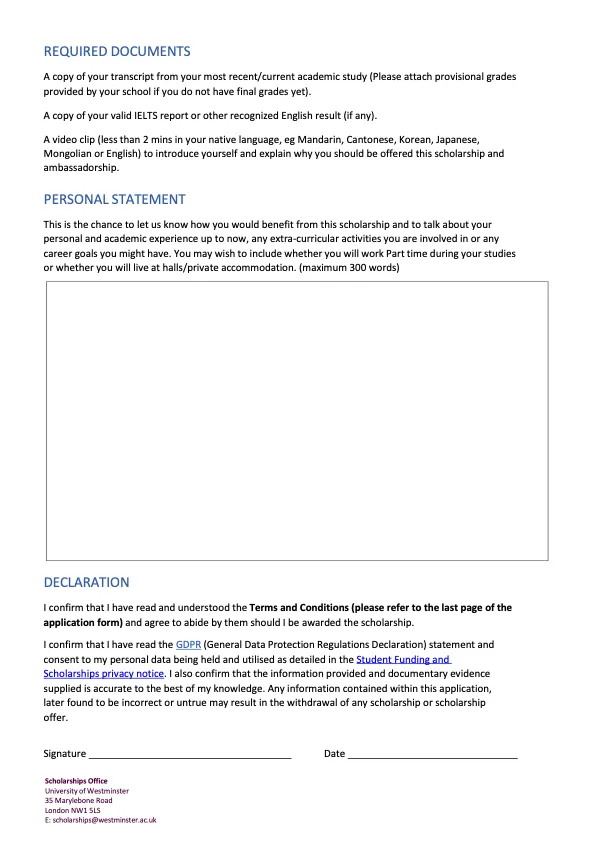 3. 请提交一段时长不超过2分钟的自我介绍视频(视频可用英语或你的母语,如普通话、粤语,并附上英文字幕),展示你代表和推广威斯敏斯特大学的热情,说明你在获得此奖学金和大使资格方面有何优势。