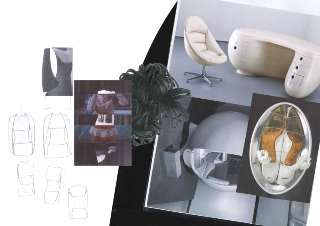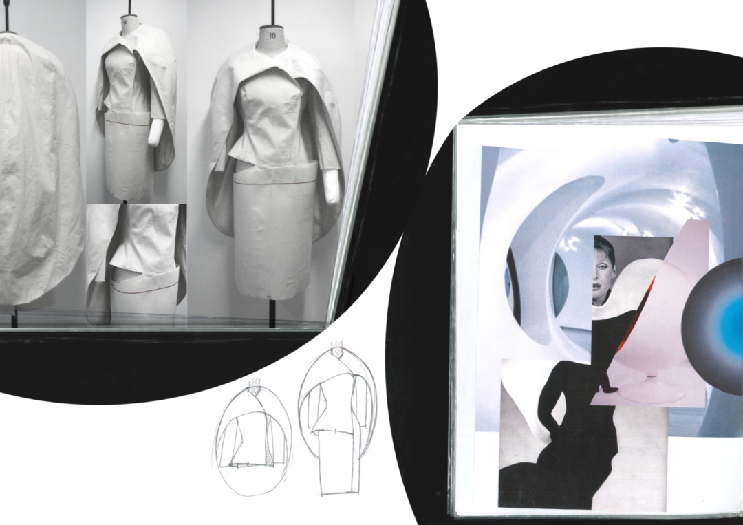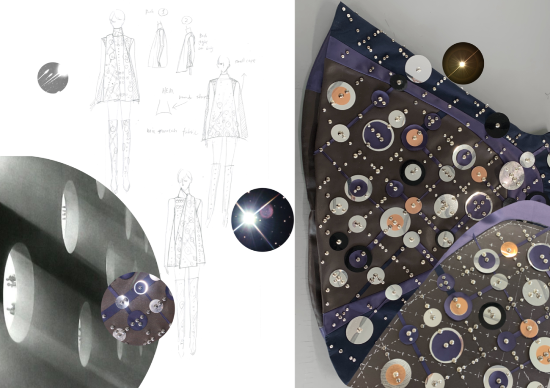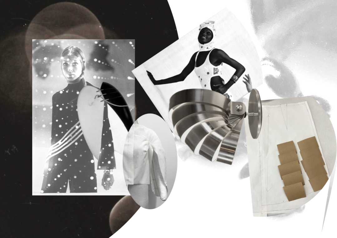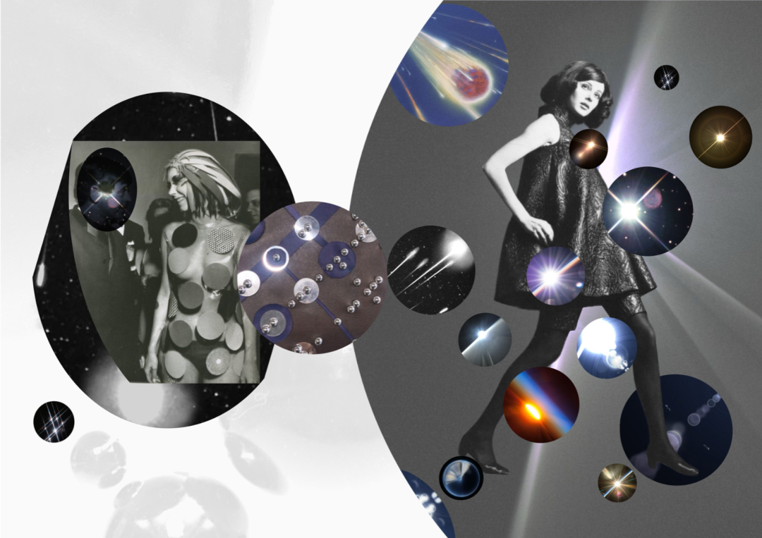 其廓形借鉴了20世纪60年代精致的极简风格,灵感来源于当时时尚与产品设计的精髓——简洁的线条、流线型形态、迷你裙、蛋椅(Egg Chair),以及埃托雷·索特萨斯(Ettore Sottsass)和 E.R. Nele 的金属灯具。面料上则融入了“宇宙”主题的元素——流星雨、陨石、月球,以及60年代科幻作品中标志性的“粉色套装”——这些通过定制的亚克力饰片、手工切割的条纹装饰、创新结合的潜水布与尼龙面料,以及手工缝制的亮片得以呈现,构成了本系列的标志性纺织品。